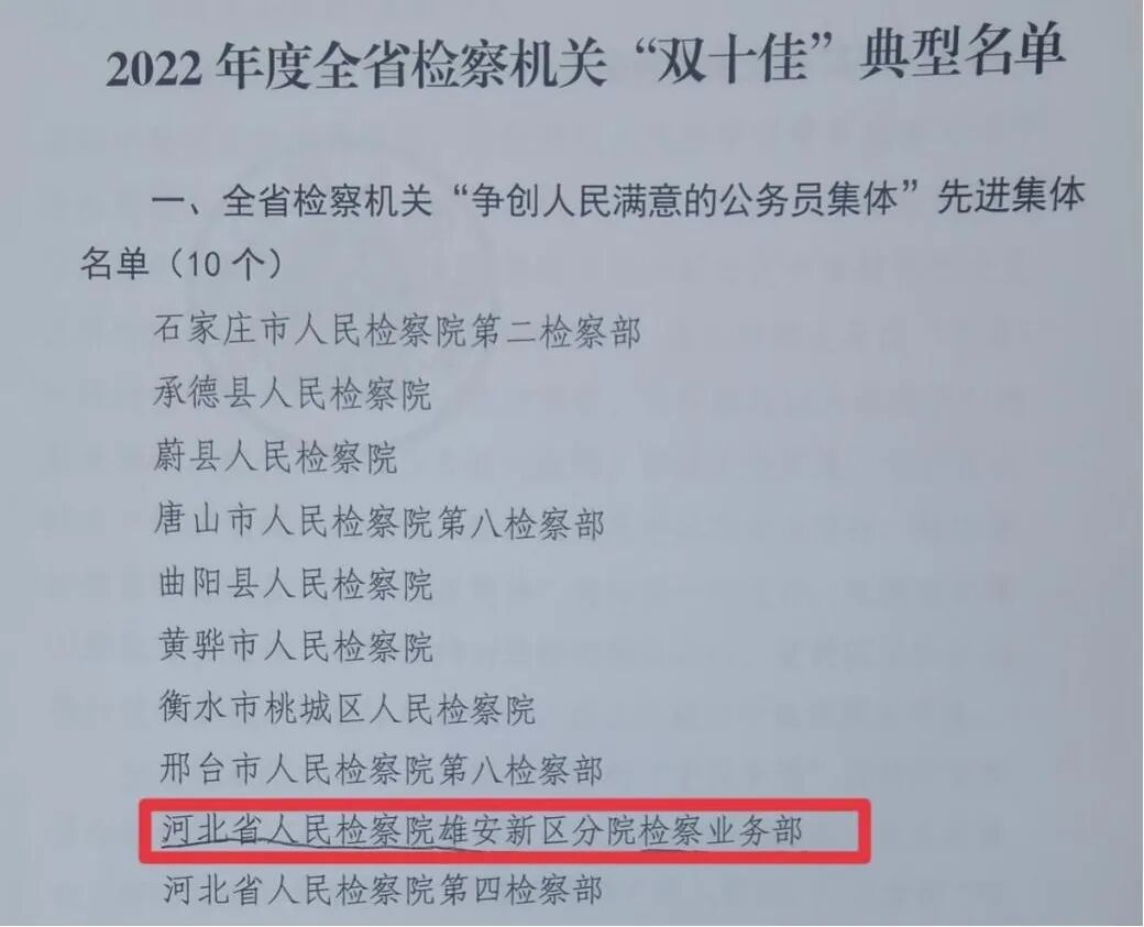 近日,2022年度全省检察机关“双十佳”典型选树结果揭晓。河北省人民检察院雄安新区分院检察业务部荣获“争创人民满意的公务员集体”先进集体称号。这次选树的先进集体和先进个人是全省检察机关“争做争创”活动中涌现出的优秀典型。