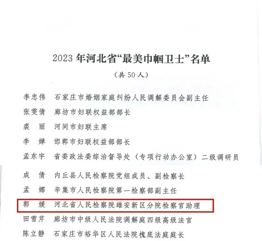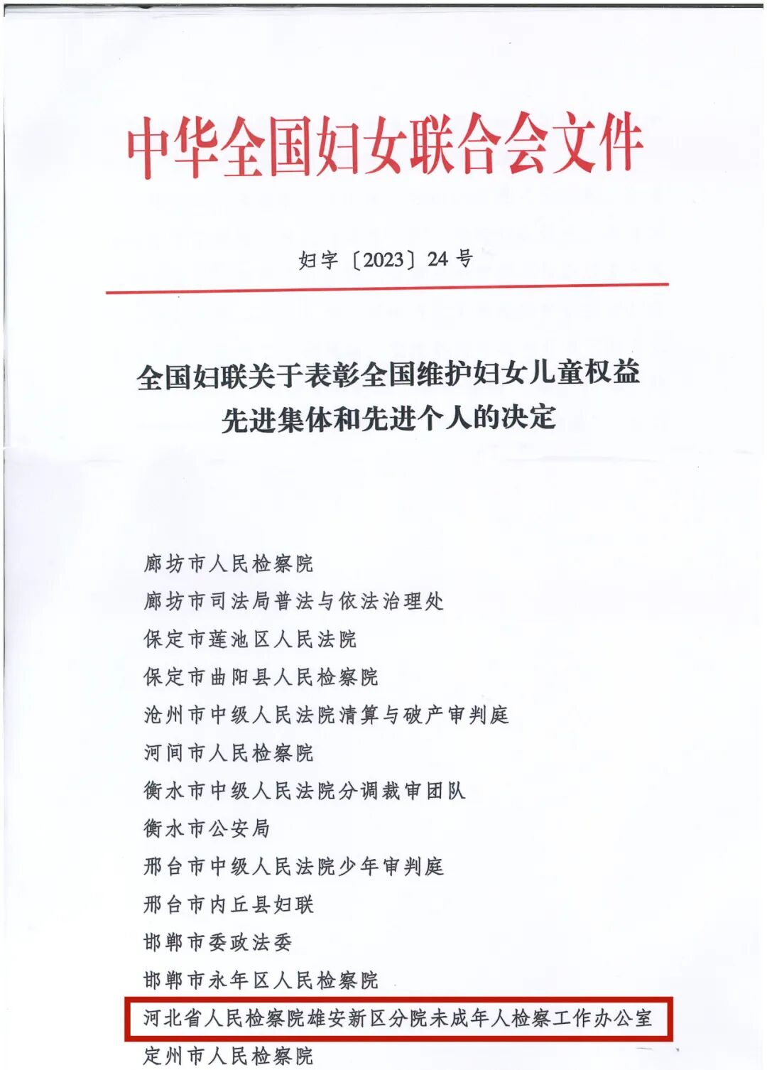 近日,全国妇联印发关于表彰全国维护妇女儿童权益先进集体和先进个人的决定。河北省人民检察院雄安新区分院未成年人检察工作办公室荣获全国维护妇女儿童权益先进集体。此外,雄安检察分院郭媛同志被命名为河北省“最美巾帼卫士”。