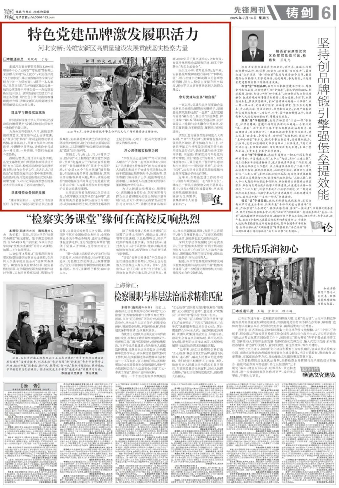 2月14日,检察日报刊发雄安新区安新县检察院《特色党建品牌激发履职活力》一文,介绍了安新县检察院以理论学习擦亮政治底色、党建引领业务创新发展、用心用情为民服务等生动检察实践。
