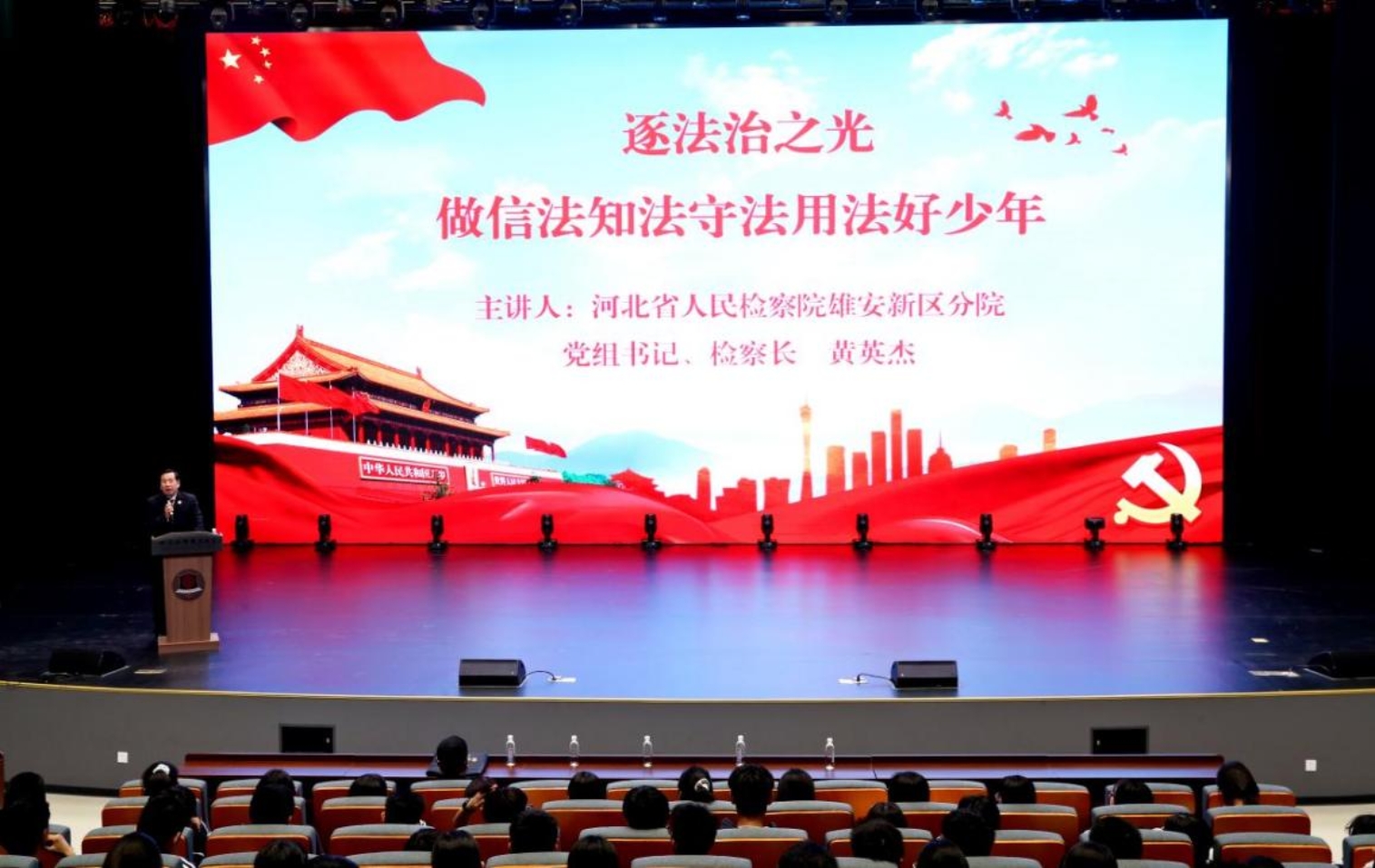 为进一步深化未成年人法治教育实效,筑牢青少年法治防线,3月11日下午,雄安检察分院党组书记、检察长黄英杰走进北京四中雄安校区开展未成年人法治教育活动,并以“逐法治之光 做信法知法守法用法好少年”为题,为400余名师生讲授新学期第一堂法治课。