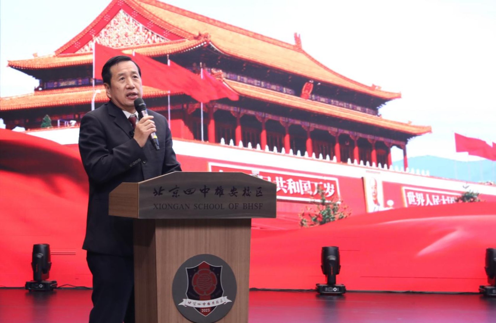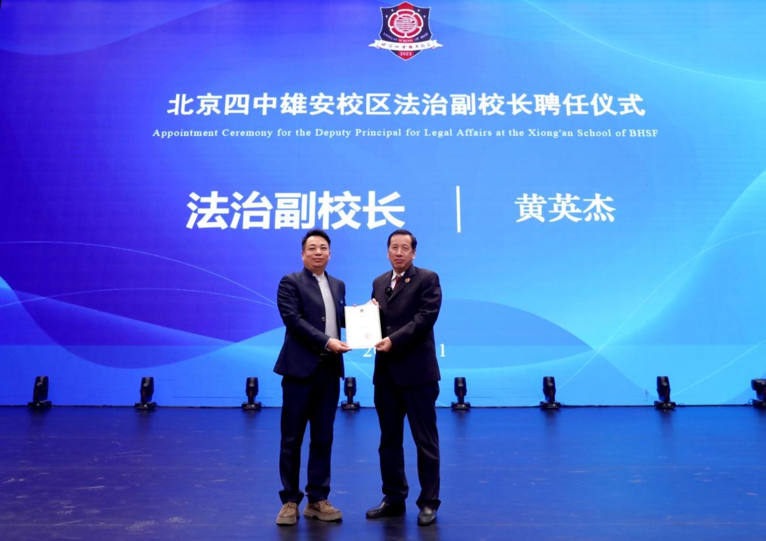 讲课伊始,举行了法治副校长聘任仪式,黄英杰检察长从北京四中雄安校区党委书记于鹏斌手中接过聘书,正式受聘为该校法治副校长。他表示将切实履行好法治副校长职责,与学校携手做好未成年人保护这项“朝阳事业”,共筑青少年法治防护网。