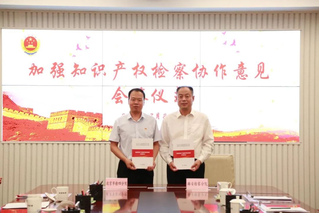 为进一步加强知识产权检察协作,完善跨区域知识产权协作保护机制,7月25日,雄安检察分院会同北京市检四分院召开加强知识产权检察协作座谈会,会签《关于加强知识产权保护检察协作的意见》。北京市检四分院党组书记、检察长田向红,雄安检察分院党组书记、检察长纪志明出席会议并讲话,两院班子成员、相关业务部门负责同志参加会议。
