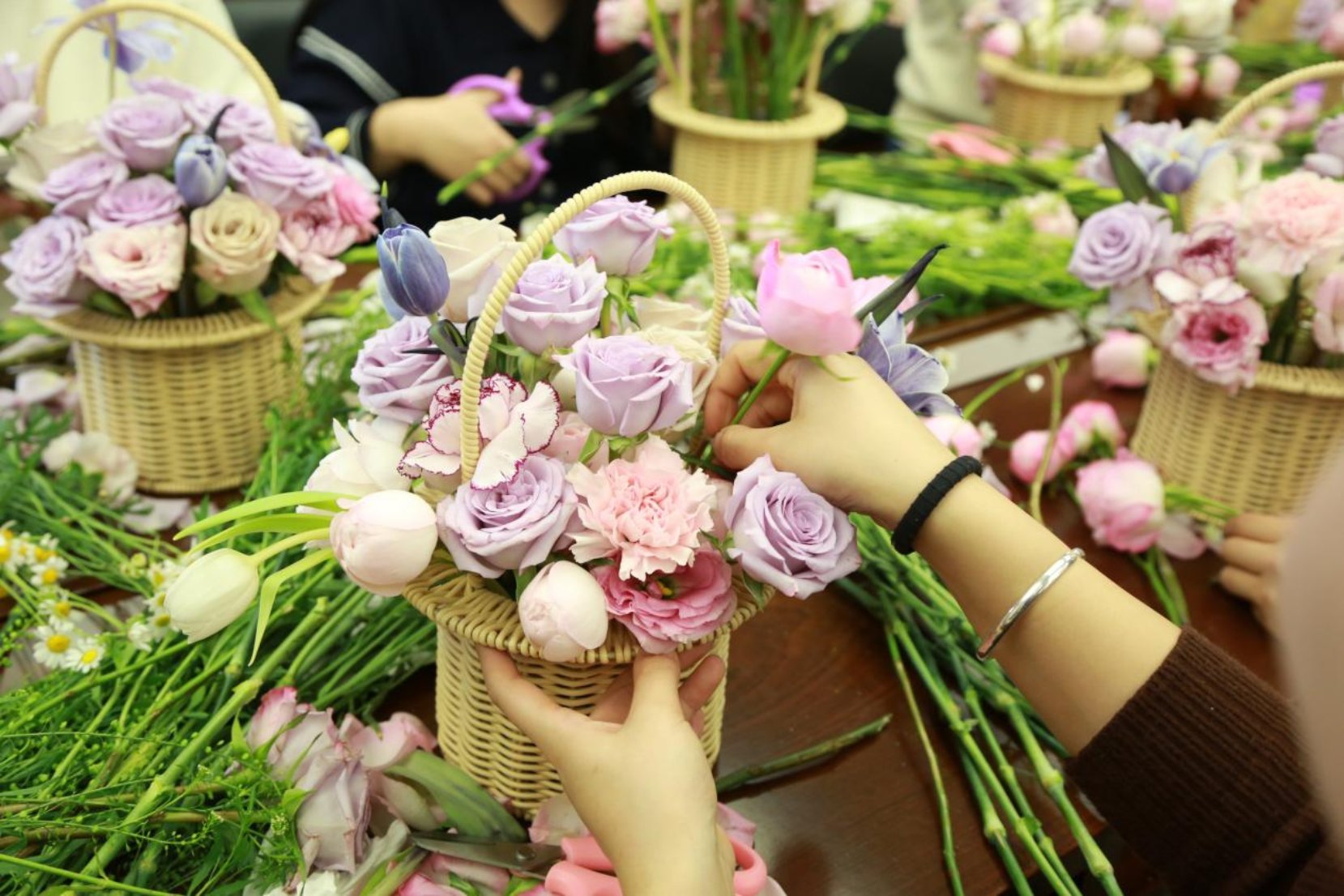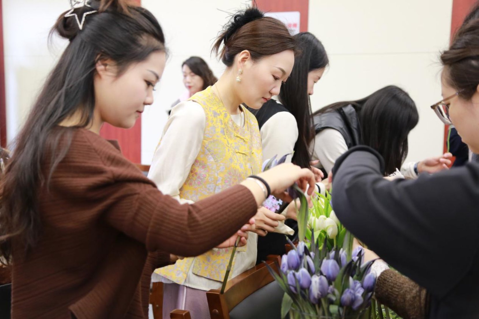 活动现场,花香四溢,氛围温馨。大家围坐在一起,认真聆听花艺技巧讲解,从花枝修剪、色彩搭配到造型构思,一步步动手创作。剪枝、插花、塑形,指尖流转间,原本零散的花枝渐渐变成错落有致、清新雅致的花艺作品。